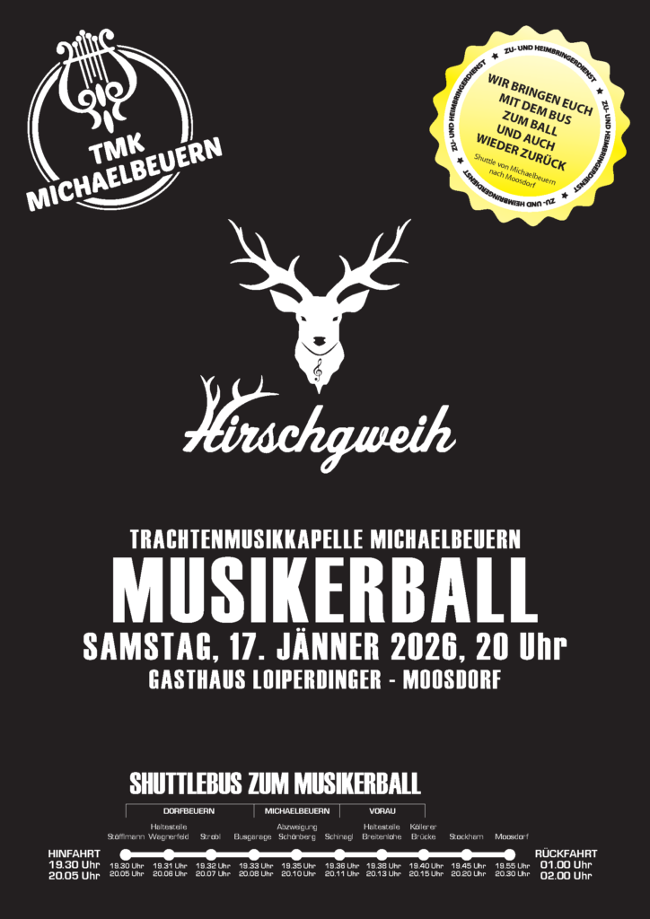 Der musikalische Höhepunkt des Winters steht wieder vor der Tür: Unser Musikerball findet am 17. Januar um 20 Uhr im Gasthaus Loiperdinger in Moosdorf statt. Wir laden euch herzlich ein, gemeinsam mit uns einen unvergesslichen Abend voller Musik, guter Stimmung und bester Unterhaltung zu erleben.